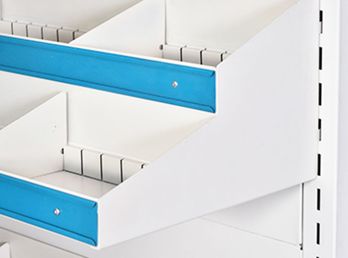 The column is made of high-quality carbon steel 40*40 square tube, the wall thickness of the tube is "1.5mm; the wall is made of 1.3mm thick high-quality cold-rolled steel plate for strong bearing capacity; the support plate, the top plate, and the bottom plate are 0.8mm thick high-quality cold-rolled plate; the connecting piece is adopted The 2.0mm thick high-quality cold-rolled steel plate is strong and durable. The bottom feet are designed with adjustable feet, so that the medicine tray is placed stably.